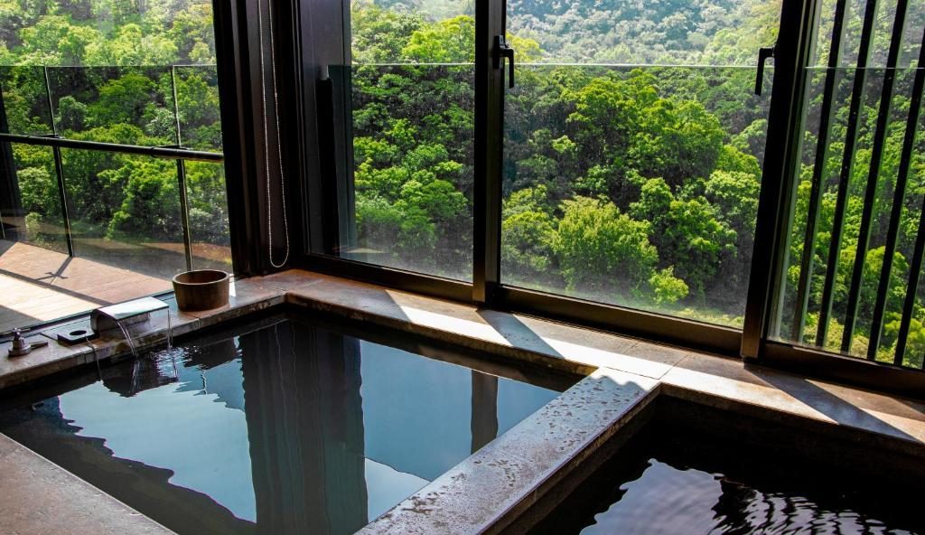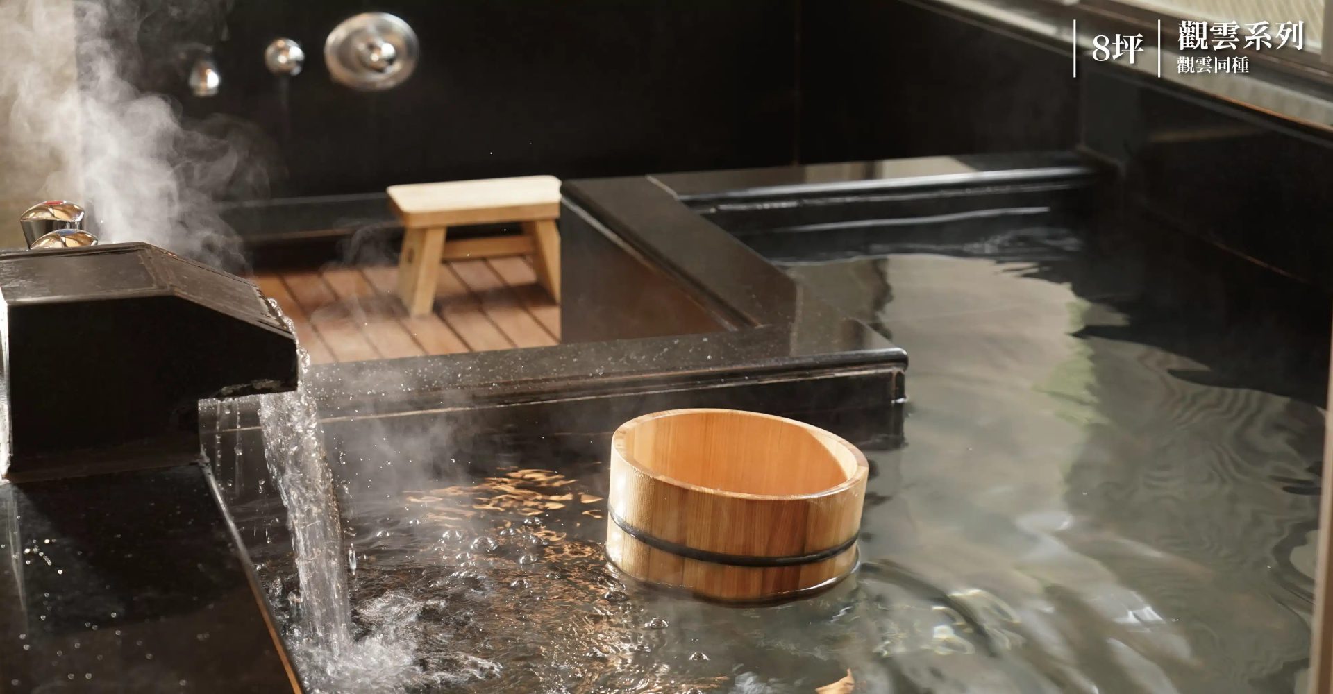 「雙喜湯屋」為園區內的獨立湯屋系列,木質裝潢與大片窗景讓人彷彿置身京都。