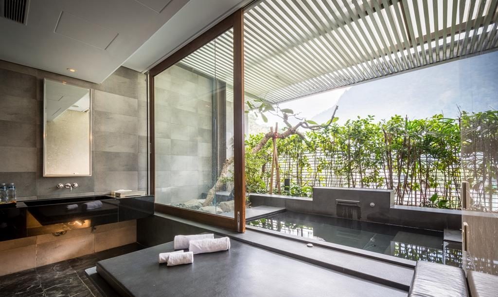 每間客房設計融合峇里島風與木質調氛圍,大片落地窗迎來谷關山景,讓旅人能在陽光灑進房內的瞬間醒來。