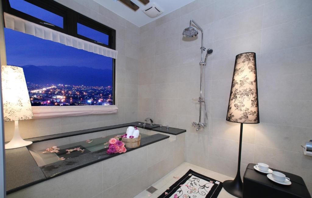 熱氣在窗邊緩緩升起,泉水的香氣混著淡淡的木質氣息,夜裡的礁溪寧靜得只剩泡湯聲。