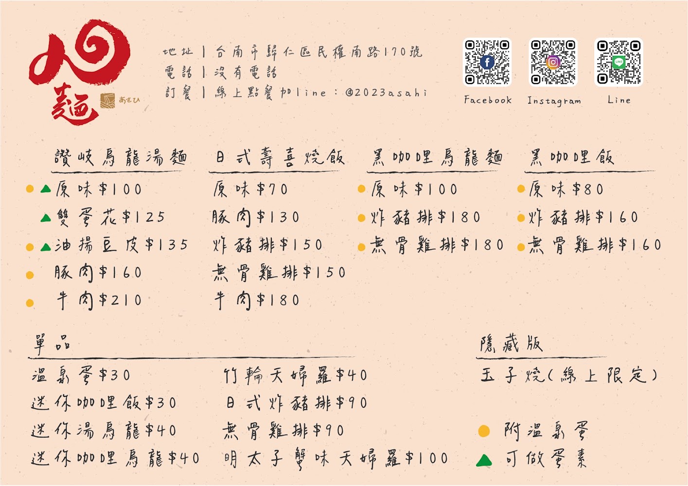 旭麵位於台南市歸仁區,是深受當地人與遊客喜愛的日式餐廳。餐廳以手工烏龍麵和濃郁豚肉湯聞名,每道料理都強調食材新鮮與精緻呈現,無論家庭聚餐或朋友小聚,都能享受舒適又溫馨的用餐體驗。
