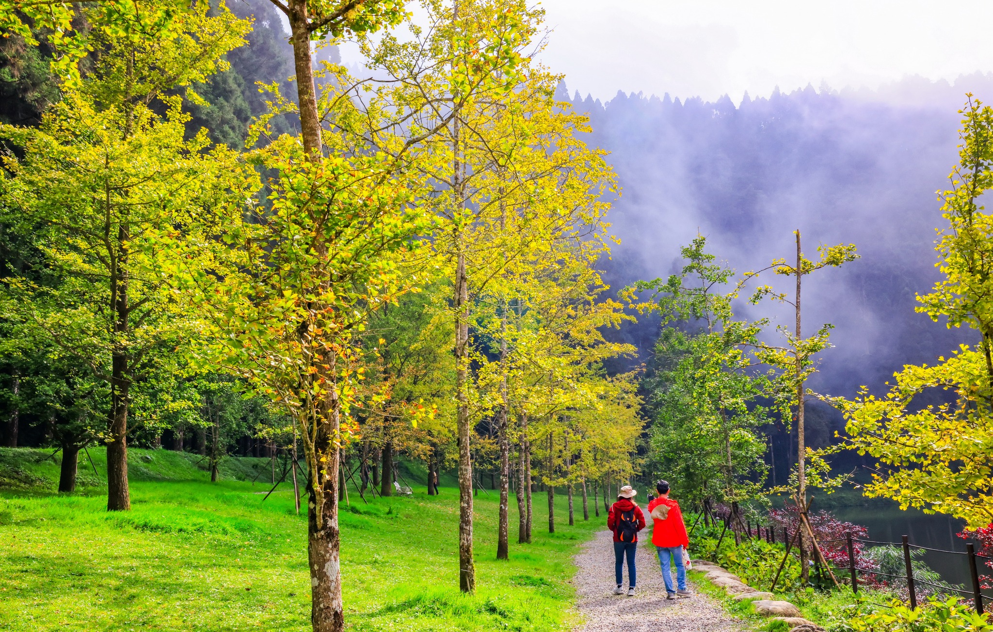 這裡環境幽靜,樹影婆娑,夏天適合感受山林的清涼氣息;秋季則能看見層層葉色倒映水面,靜謐而療癒。