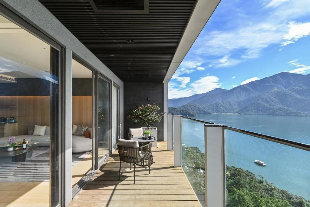 拉開陽台的門,一陣清風掠過,湖水微微閃著光。遠方的山影被霧氣染成柔灰色,天際透著一抹金。時間在這裡變慢,你只聽見風聲、鳥鳴,和自己心跳的節奏。