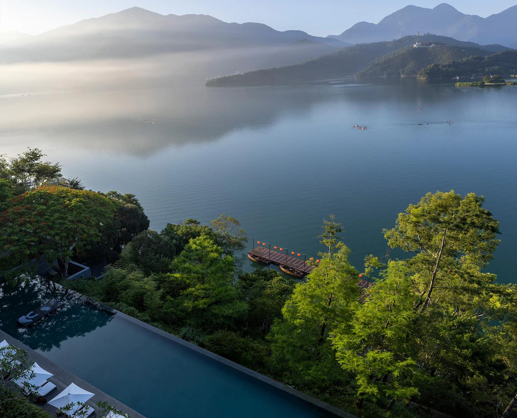 涵碧樓酒店坐落於魚池鄉涵碧半島,視野幾乎可環望整個湖面,是日月潭最具代表性的頂級度假飯店。建築以極簡東方禪意為靈魂,融入山色與風光,讓旅人得以在自然中沉靜。客房以落地窗引入日光,部分房型附設私人泳池或露台浴缸。餐飲提供中式、日式與輕食吧,湖畔 Spa 與無邊際泳池更是靜心首選。