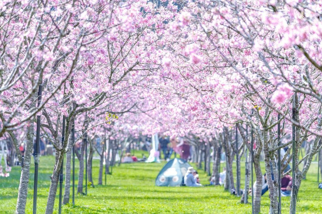 這座公園占地廣闊,種植了數百株品種各異的櫻花,包括知名的 河津櫻八重櫻 以及 綠萼櫻 等。每年二月至三月間,不同品種依序綻放,形成長達數百公尺的櫻花隧道,讓遊客彷彿置身於日本京都的粉色國度中,感受濃厚的春日氛圍。