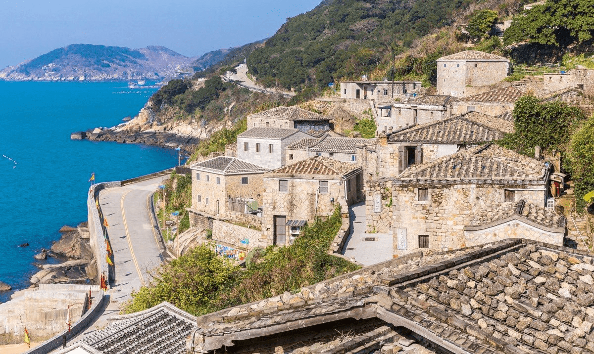 北竿島東北方的芹壁聚落,是馬祖保存相當完整的花崗岩石屋村落。村落沿山坡層層而建,灰色石牆搭配紅瓦屋頂,面向遼闊海岸,形成極具辨識度的景觀。