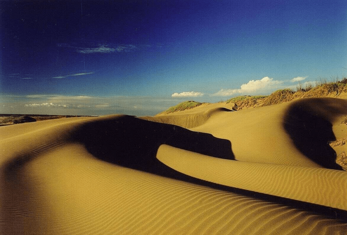 腳踩在柔軟細沙上,沙粒隨風輕輕移動。這裡沒有商店與觀光設施,只有海聲、風聲與廣闊的地平線。傍晚時分,夕陽慢慢沉入海面,整片沙丘被染成暖金色,光影在沙紋之間流動,畫面簡單卻充滿力量。