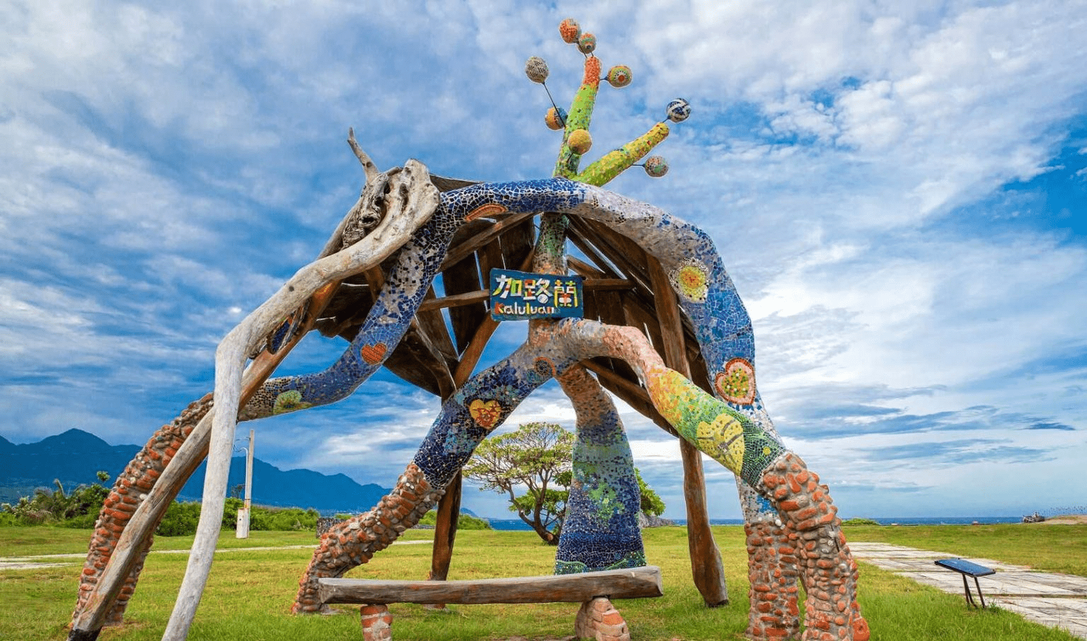 這裡原是阿美族聚落,「加路蘭」在族語裡有洗頭的意思。現在的園區,多了漂流木構成的裝置藝術,靜靜立在草地上——有的像人、有的像風,與海的節奏自然融合。