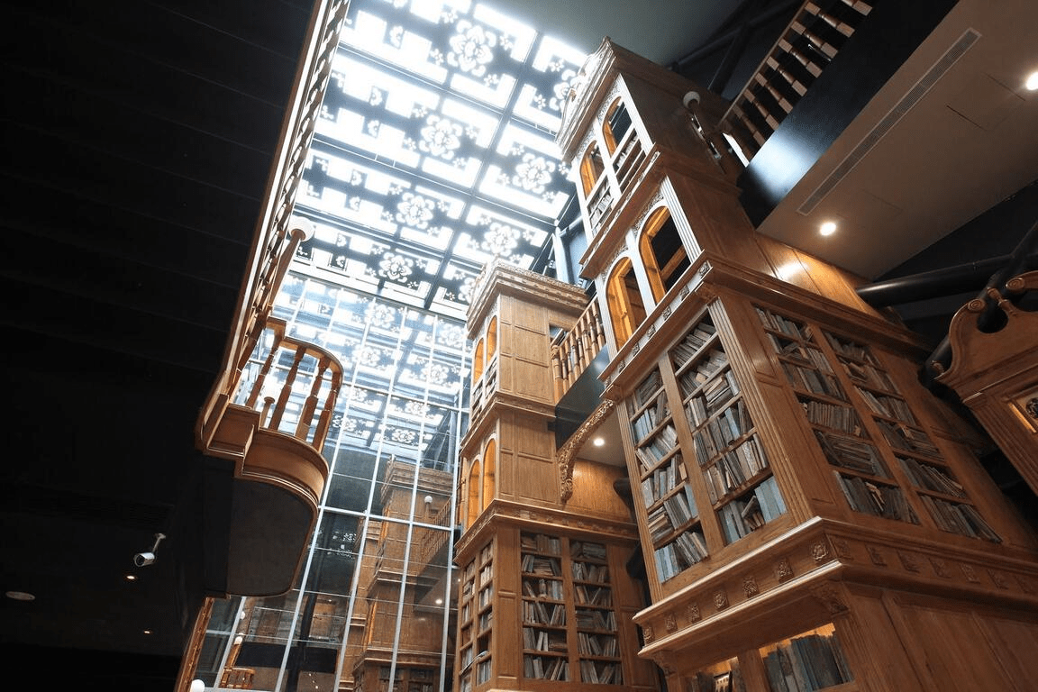 抬頭看,高聳的書牆延伸到天花板,燈光從不同角度落下,讓整個空間像是一座靜靜發光的老圖書館。木質地板、復古櫃體與紅磚結構交錯,走在其中,會不自覺放輕腳步。